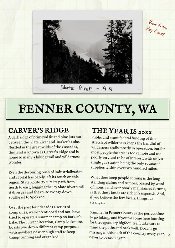 Carver's Ridge, a 44 page wilderness horror pointcrawl is now out! It's a big horror sandbox through some spookier parts of Washington State, come check it out!
