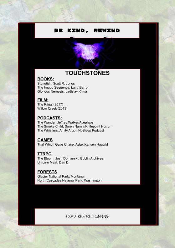| Tags | Horror, horror-rpg, Modern, pointcrawl, Tabletop, Tabletop role-playing game, wilderness-horror |